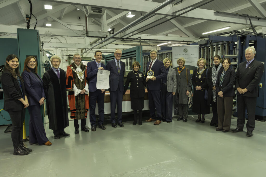 Guests were welcomed to the historic mill for a tour showcasing the traditional craftsmanship and modern innovation that defined Sudbury Silk Mills. The formal presentation took place on the weaving floor, with the working looms and warping machines providing a fitting backdrop to celebrate the company’s legacy of excellence. Members of the Sudbury Silk Mills team gathered to witness the occasion and celebrate this proud moment in the company’s history. The Countess delivered a short speech recognising the company’s excellence in sustainable manufacturing, after which Julius Walters, Managing Director of Sudbury Silk Mills, thanked the team and highlighted the significance of the award for the company’s ongoing commitment to innovation and environmental responsibility.